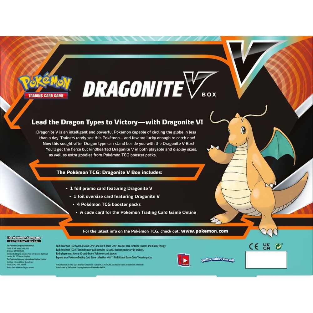 Deze Pokémon wordt zelden gezien door trainers en slechts weinigen hebben het geluk er één te vangen. Daarnaast is deze draak een evolutie van Dratini en Dragonair. Dragonite wordt ook wel eens als vriend van de mens gezien. Hij vliegt sneller als de snelheid van het licht. Er wordt wel eens gezegd dat deze draak ervoor zorgt dat verloren schepen veilig aan wal kunnen gebracht worden. Deze Pokémon zal zijn omgeving en naasten in veiligheid brengen, want hij zal er alles voor doen om deze te beschermen. Hij zal alles kapotslaan op een oncontroleerbare en destructieve manier. Laat je meeslepen door deze geweldige draak en neem samen met hem een sprong in het onbekende. Deze gewilde Dragon-type kan naast je staan met de Dragonite V Box! Je krijgt de felle maar goedhartige Dragonite V in zowel speelbare als oversized formaat, evenals extra goodies uit Pokémon TCG-boosterpakketten.