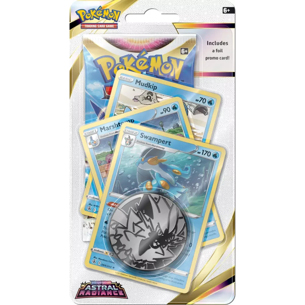 Astral Radiance Swampert Premium Checklane: Travel back to a land of myths, legends and wilderness as Origin Forme Dialga VSTAR and Origin Forme Palkia VSTAR. Distort the fabric of time and space! Decidueye, Typhlosion and Samurott arrive as Hisuian Pokémon VSTAR and join more Pokémon and Trainers from the ancient region of Hisui. Meanwhile, Shiny Pokémon reappear as Radiant Pokémon, with Radiant Greninja leading the charge in the Pokémon TCG: Sword & Shield – Astral Radiance expansion!