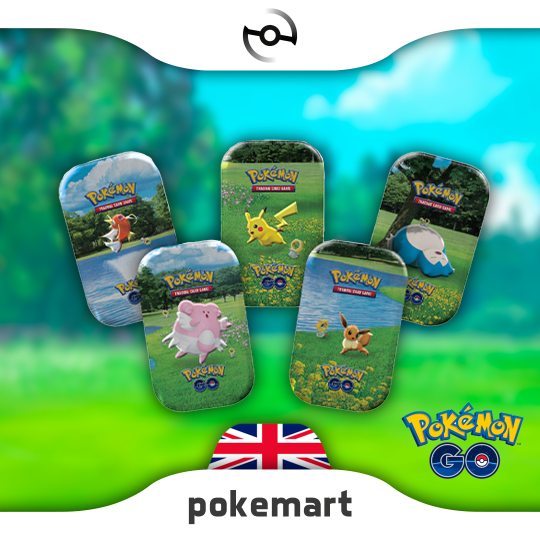 Pokémon GO Mini Tin art set: Boost your collection of cards from the Pokémon TCG: Pokémon GO expansion with these charming mini packs. Each tin contains two booster packs from the expansion and a metallic coin. There are five different Mini Tins to collect, and each Mini Tin includes an art card with the artwork from the tin’s lid. You can even combine all five art cards to form a larger image!