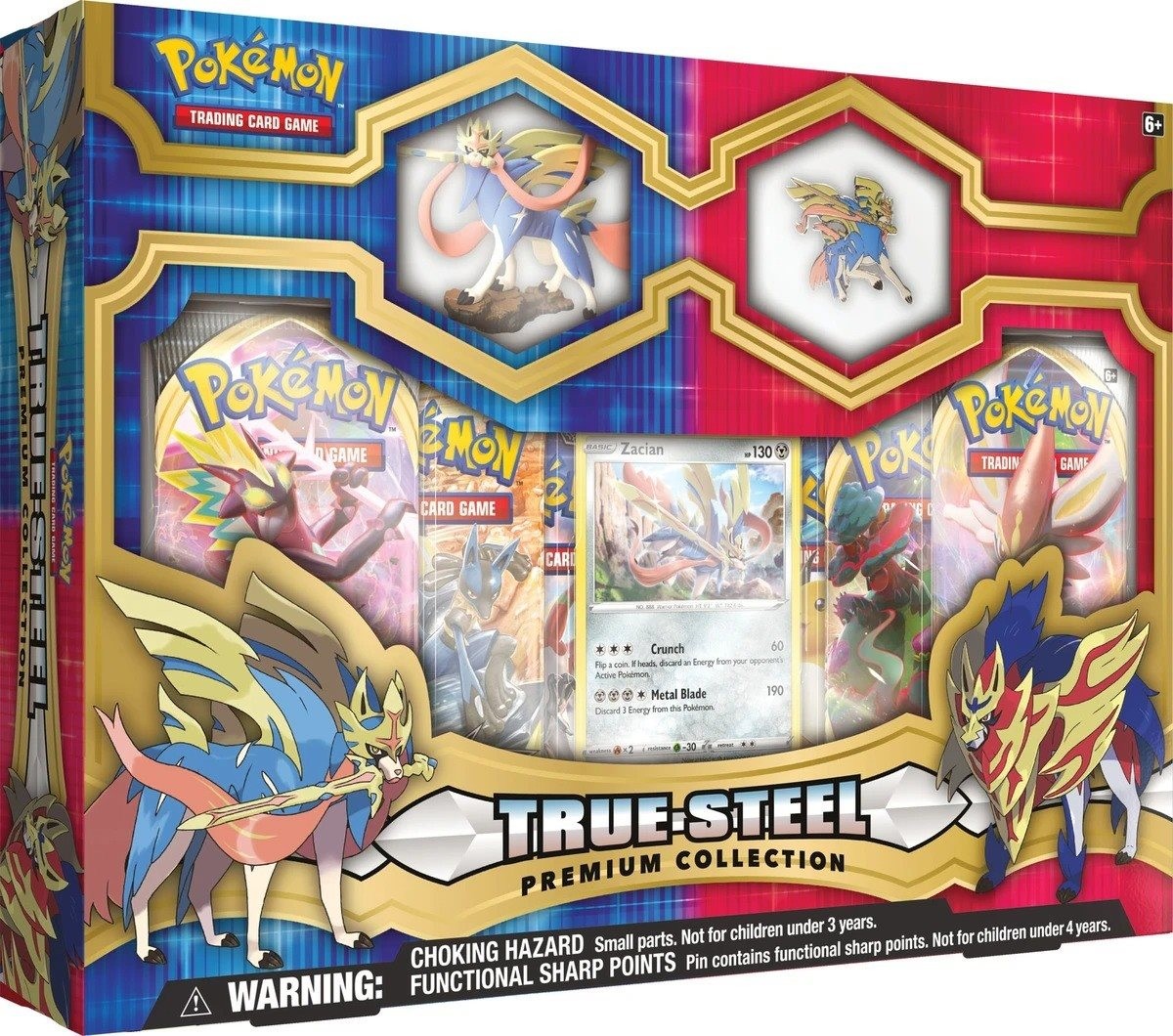 True Steel Premium Collection: Je kunt op deze Pokémon rekenen – hun stalen geesten zijn getest, zoals het de Legendarische Pokémon van Galar betaamt! En wat is een betere kroon op je verzameling dan een van de machtigste Pokémon van deze regio? Deze collectie bevat een van de Warrior Pokémon in drie vormen – als een figuur, een verzamelpin en een promokaart van folie – samen met schatten die te vinden zijn in Pokémon TCG-boosterpakketten.